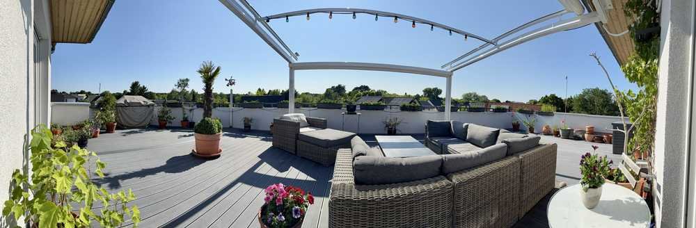 Die offene Raumgestaltung schafft ein luftiges Wohnambiente mit fließenden Übergängen zwischen Kochen, Essen und Wohnen. Herzstück der Wohnung ist die beeindruckende ca. 75 m² große Terrasse, die sich nach Südwesten orientiert. Dank unverbaubarem Blick und vollständiger Uneinsehbarkeit genießen Sie hier Ihre private Oase über den Dächern der Stadt – ganztägig lichtdurchflutet und abends in goldenes Licht getaucht.
