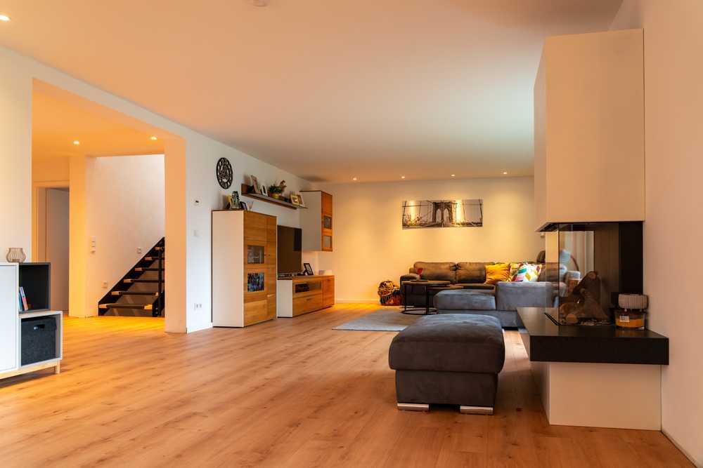 Beim Betreten des Hauses wird man von einem hellen und großzügigen Eingangsbereich empfangen. Die offene Gestaltung des Wohn- und Essbereichs schafft eine einladende Atmosphäre. Große Fensterfronten sorgen für eine angenehme Lichtdurchflutung und bieten einen herrlichen Blick ins Grüne. Die Böden sind mit hochwertigem Vinyl und eleganten Fliesen ausgelegt, was für eine warme und luxuriöse Wohnatmosphäre sorgt. Der eingebaute Kamin ist an die Gasversorung angeschlossen und erfüllt auch an kalten Tagen das Haus mit einem warmen Ambiente.