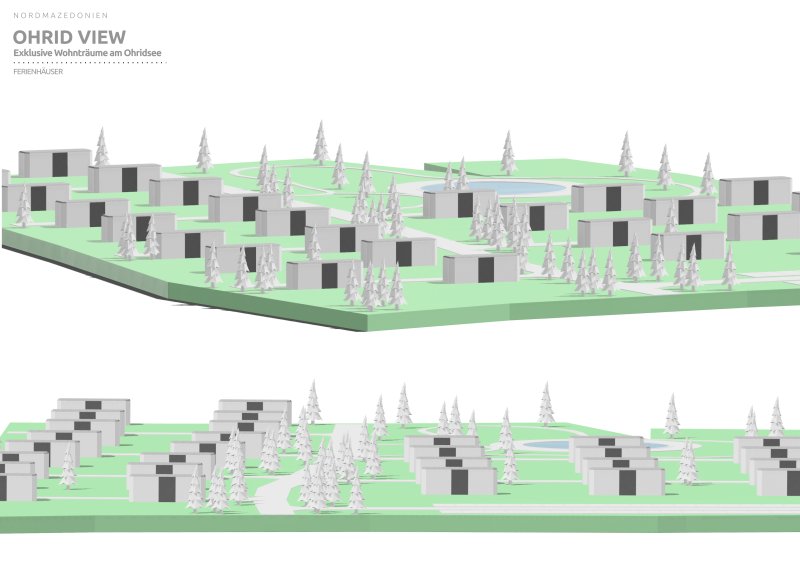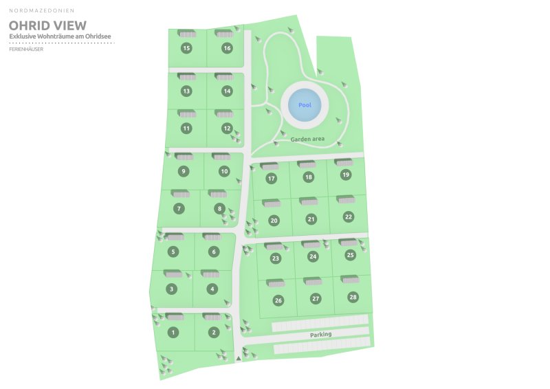 Das Projekt “Ohrid View” bietet eine exklusive Gelegenheit, in eine hochwertige Wohnanlage am malerischen Ohridsee in Nordmazedonien zu investieren. Auf einem großzügigen Areal von 21.800 m² entstehen 28 moderne Häuser, die nach höchsten Qualitäts- und Komfortstandards entworfen wurden. Jedes Haus verfügt über eine Wohnfläche von 48 m² und steht auf einem eigenen Grundstück von etwa 400 m² (Gesamtfläche pro Eigentum beträgt ca. 778 m2). Darüber hinaus profitieren die Bewohner von gemeinschaftlich genutzten Flächen, die unter anderem einen Pool, eine Grillzone und panoramische Terrassen umfassen.