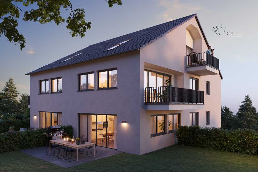 gespiegelten Wohnungen. Zwei 2-Zimmer-Wohnungen à ca. 53 m² Wohnfläche befinden sich im Hanggeschoss. Beide Wohnungen verfügen über eine ca. 12 m² große Terrasse. Im Erdgeschoss folgen zwei 3-Zimmer-Wohnungen mit Tageslichtbad, offenem Küchen-, Wohn- und Essbereich, ca. 85 m² Wohnfläche sowie ca. 20 m² Terrasse mit Garten. Im Obergeschoss befinden sich zwei 3-Zimmer-Wohnungen mit jeweils 77 m² Wohnfläche und Balkon. Abgerundet wird das Objekt mit zwei gemütlichen, ca. 49 m² großen 2-Zimmer-Wohnungen mit Balkon im Dachgeschoss. Selbstverständlich sind alle Wohnungen per Aufzug barrierefrei erreichbar.