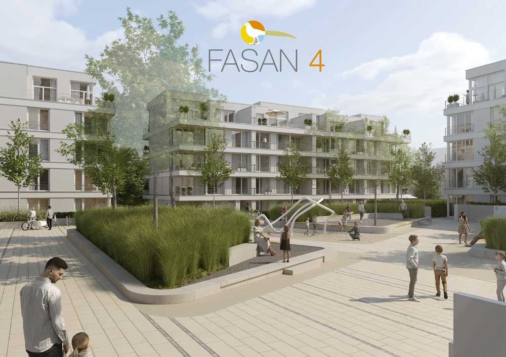 Das Gebäude FASAN 4 liegt am neu entstehenden, mit Bäumen, Hecken und Gräsern begrünten Fasanenplatz.
