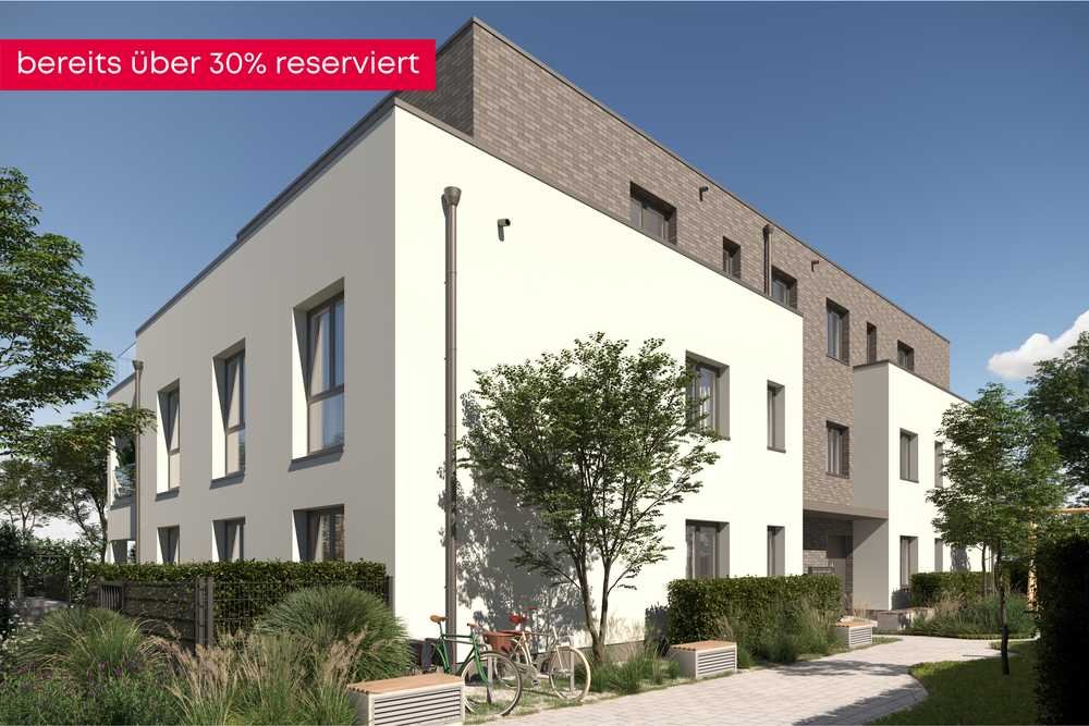 dem Fahrrad nur 8 Minuten – von hier aus geht es stressfrei nach Frankfurt weiter. Loggien, Terrassen, Dachterrassen und die Gärten der Erdgeschosswohnungen sind nach Süden ausgerichtet. Die Tiefgarage