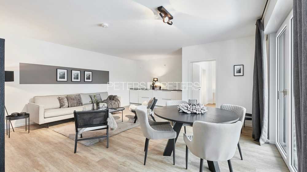 Durch eines der vielen bodentiefen Fenster blickt man direkt ins saftige Grün der freundlichen Einfamilienhaus-Gegend. Wer mittendrin sein möchte, und doch ein kleines bisschen nebenan, der ist hier genau richtig.