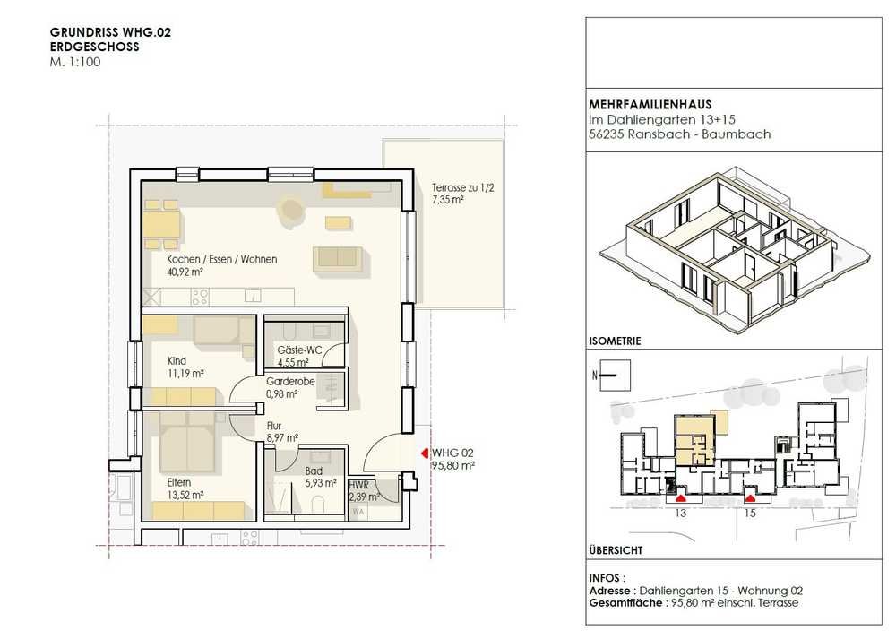 Die hier angebotene 3-Zimmer-Wohnung befindet sich im Erdgeschoss und verfügt über eine Wohnfläche von ca. 95,80 m². Vom Flur- und Eingangsbereich betreten Sie den offenen und ca. 40,92 m² großen Wohn-, Ess- und Küchenbereich mit Zugang zur einladenden Sonnenterrasse. Ebenfalls vom Flur aus betreten Sie das Elternzimmer, das Kinderzimmer sowie abschließend das Badezimmer. Ein praktischer Hauswirtschaftsraum rundet die Wohnräumlichkeiten ab.