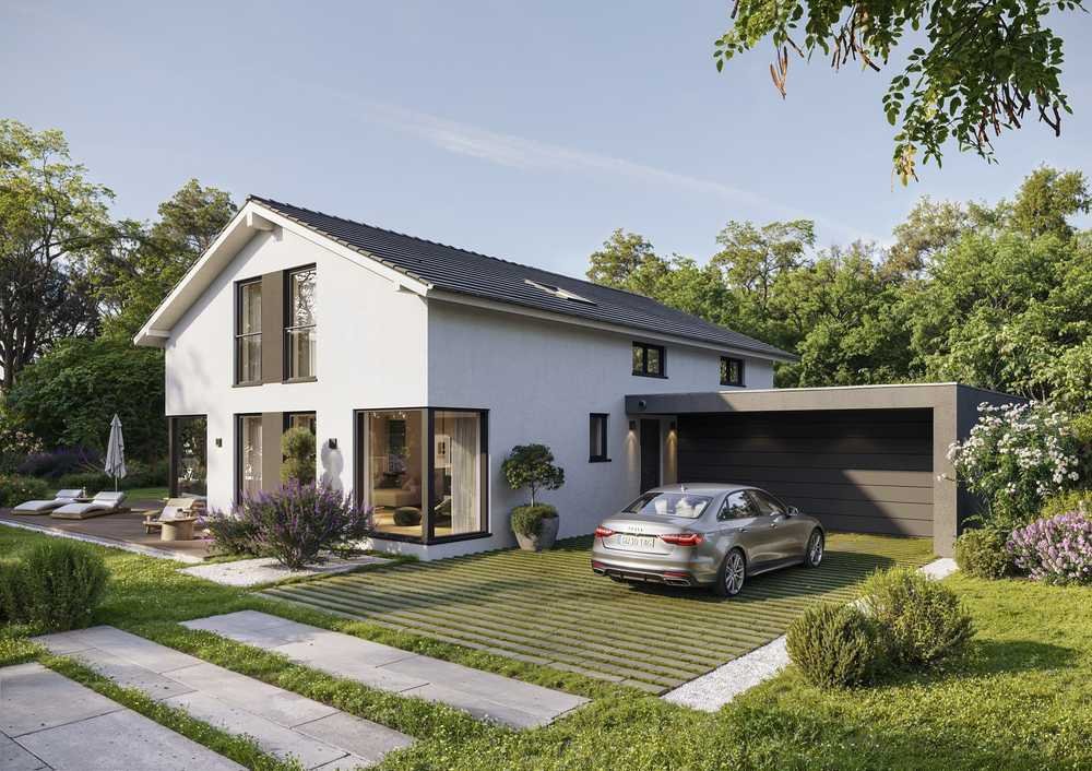 Beim Haus handelt es sich um einen Bebauungsvorschlag. Der Preis beinhaltet das abgebildete Haus inklusive Grundstück und Keller ohne Baunebenkosten. Grundrissänderungen oder individuelle Planung ist jeder Zeit möglich.