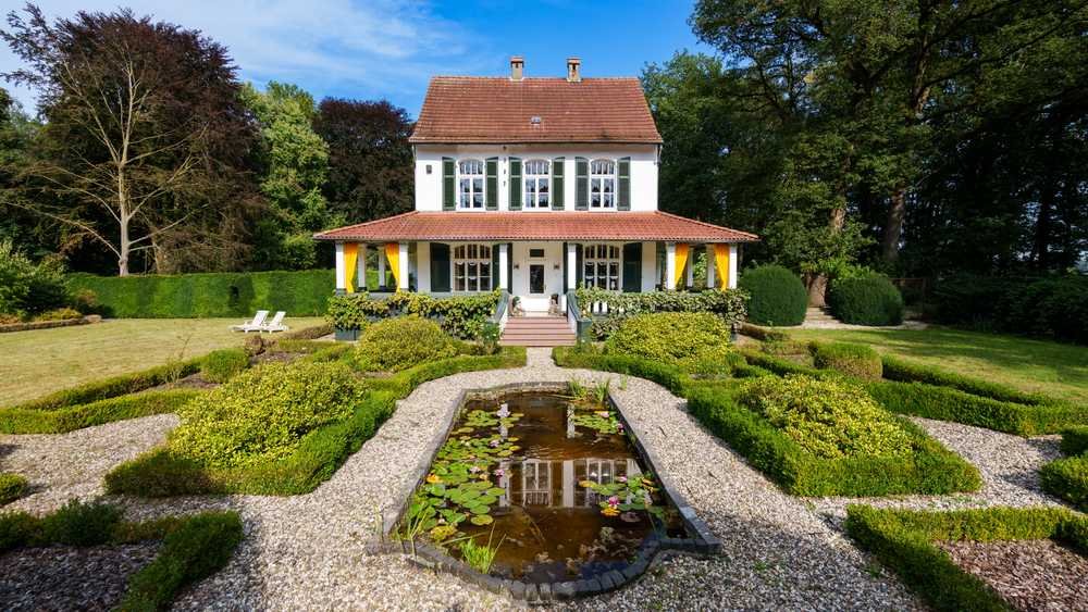 Das Gesamtbild aus grünen Fensterläden, den historischen stilvollen Fenstern, den sonnengelben Vorhängen zwischen den Säulen, verleiht dem Haus das Attribut eines Traumhauses. Die vom Kiesbett umgebene Teichanlage wurde in der Mittelachse des Hauptportals angeordnet. So wirkt es auf die Bewohner einladend und ist die optische Grundlage für diesen charaktervollen Landsitz.