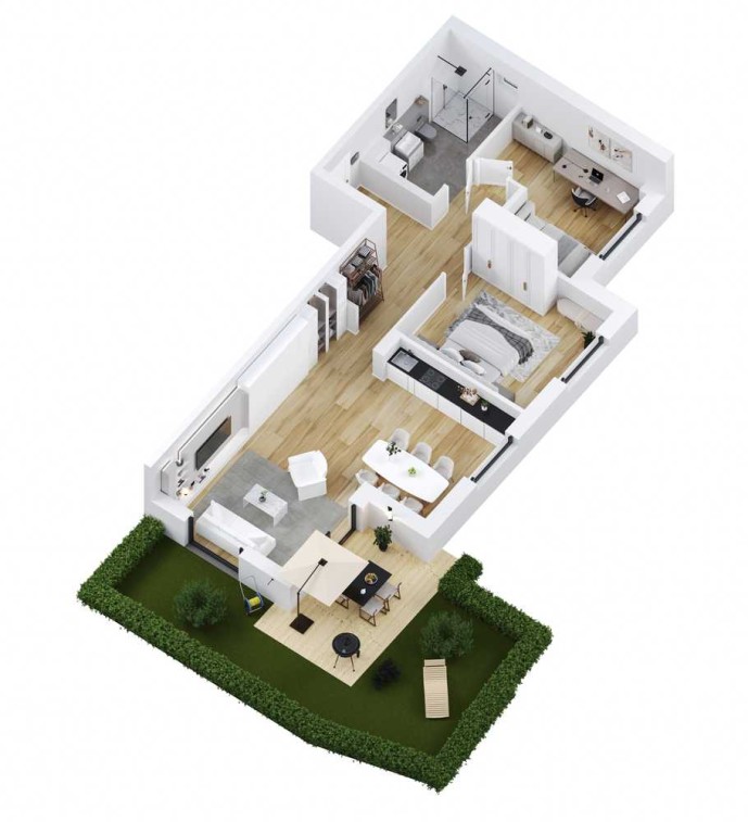 Im Schlafzimmer findet ein 4 Meter Kleiderschrank bequem Platz und auch ein 2 auf 2 Meter Bett fühlt sich darin wohl.