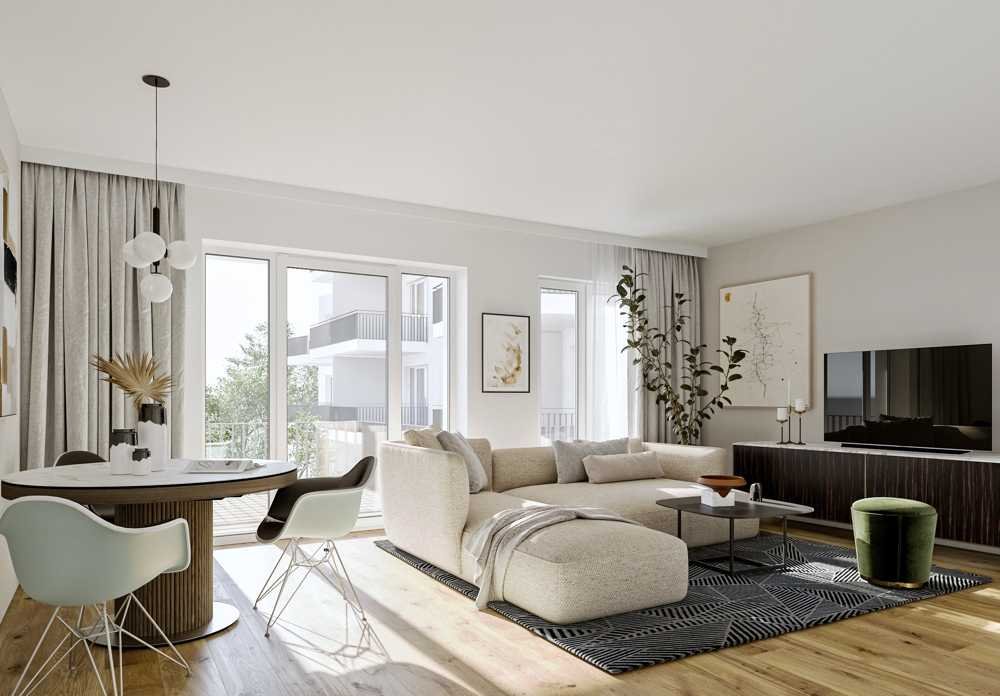 Alle Wohnräume erhalten Fußbodenheizung und einen hochwertigen Fußbodenbelag mit 3-Schichtparkett, der für ein gemütliches Ambiente sorgt. Die Böden der Bäder, Küchen und Abstellräume werden mit großformatigen Fliesen (ca. 60 cm x 60 cm) gefliest. Alle Räume der Wohnungen werden zudem mit glatten weißen Türen und Zargen ausgestattet und die weißen Kunststofffenster mit Sonnenschutz sind natürlich 3-fach verglast.