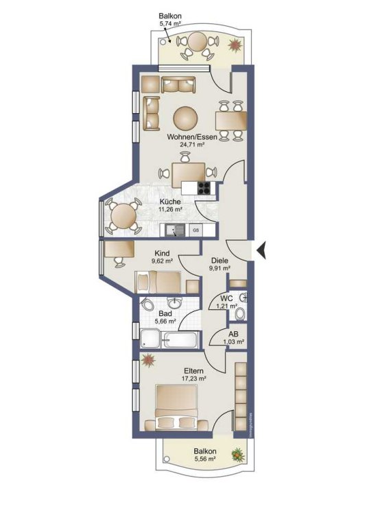 Die zum Verkauf stehende ETW liegt im Vorderhaus des 1996 erbauten Hauses in der zweiten von insgesamt vier Etagen. Über den Wohnungsflur gelangt man in alle Zimmer. Das helle Wohnzimmer mit den bodentiefen Balkonfenstern führt auf einen der beiden gemütlichen Balkone. Der Übergang zum offenen Küchen- und Essbereich gibt dem Raum viel Ausstrahlung und Weite. Das Schlafzimmer liegt auf der anderen Seite der Wohnung. Daneben befindet sich das Wannen und Duschbad sowie das Büro Kinderzimmer. Ebenso geht vom Flur eine Abstellkammer und das Gäste WC ab. Die Wohnung ist sehr ruhig gelegen. Ein Tiefgaragenstellplatz für Ihr Auto wird zum Preis von 79.000 € verkauft. Der Gesamtpreis beträgt somit 578.000 €. Einen Garten gibt es zwar nicht aber die beiden großzügigen Balkone entschädigen voll und ganz und laden zum Entspannen ein oder sogar mal zum Urlaub auf Balkonien. Die Wohnung verfügt zusätzlich über einen Abstellraum im Keller.