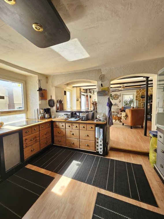 EG: die Wohnung hat ca. 80m² und sticht durch das Fachwerkflair besonders heraus, 1 Schlafzimmer, 1 Kaminzimmer, 2 Kachelöfen welche mit Gas und mit Holz betrieben wird. Die rustikal ausgestattete Küche hat einen außergewöhnlichen Charme. Die Dusche ist mit Mosaik bestückt. Derzeit bewohnt vom Eigentümer selbst.