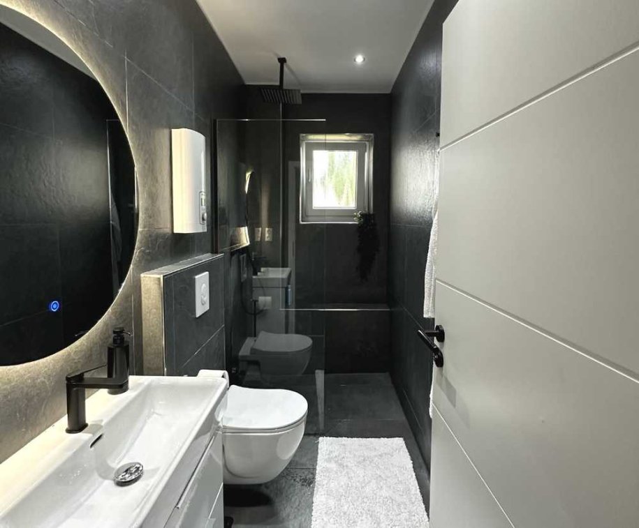 Im neu gestalteten Badezimmer sorgt eine großzügige Walk-In-Dusche mit bodentiefem Zugang und stilvollen Armaturen in Matt-Schwarz für ein exklusives Ambiente.