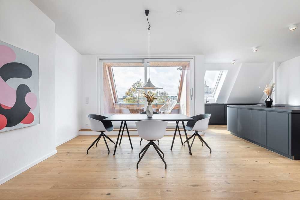 Die entstandenen Dachgeschosswohnungen sind zwischen 88 und 163 qm groß und bieten 3 bis 5 Zimmer, was sie ideal für Familien, Paare oder auch Singles macht. Jede Wohnung verfügt über eine durchdachte Raumaufteilung und eine großzügige, halb-überdachte Terrasse, die mit robusten Terrassendielen aus Nordischer Lärche sowie einer Markise für sommerlichen Licht- und Wärmeschutz ausgestattet ist. Große Fensterflächen und Oberlichter sorgen für viel Tageslicht und eine einladende Atmosphäre. Hohe Decken von 2,60 bis 3,20 Metern, ein langlebiges sowie edles Eichenparkett und eine per App steuerbare Fußbodenheizung mitsamt Trittschalldämmung sorgen für zusätzlichen Wohnkomfort.