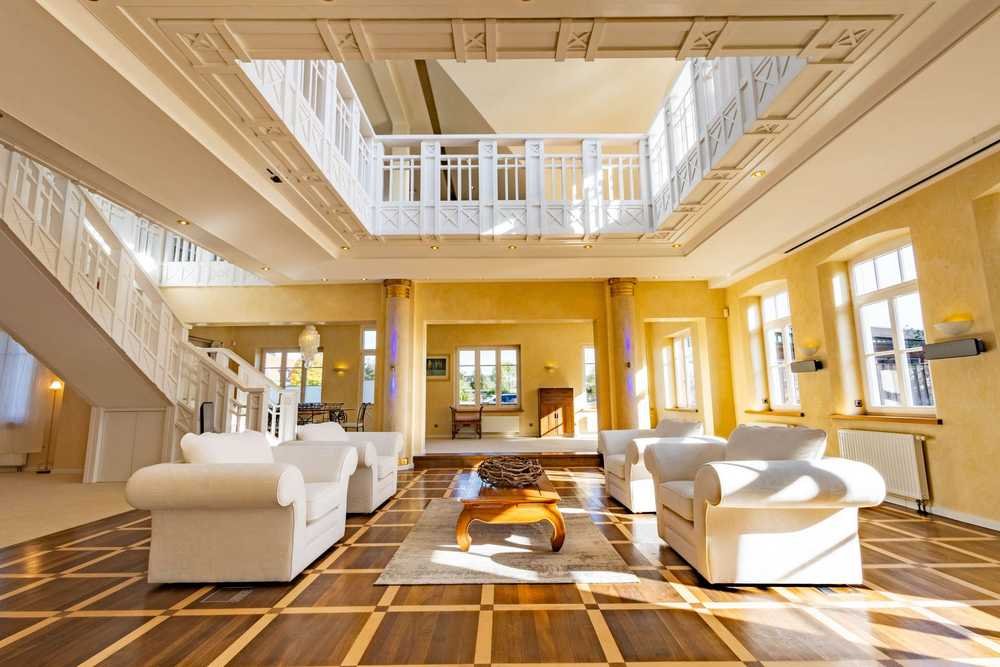 Das Herzstück des Haupthauses finden Sie angrenzend an den Wohn- und Essbereich. Dieser Teil des Hauses besticht durch die offene Architektur und die vorhandene Galerie. Die Galerie vereint mehrere Wohnflächen im selben Raum und bringt weitläufige Aussicht und viel Licht in die Räumlichkeiten.