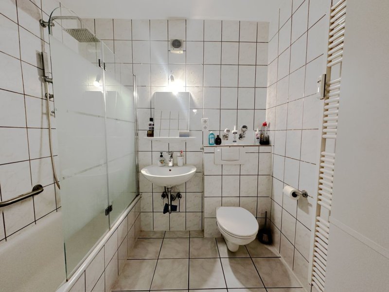 Das geräumige Schlafzimmer bietet viel Tageslicht und eine angenehme Wohlfühlatmosphäre. Das deckenhoch geflieste Badezimmer punktet mit hochwertiger Ausstattung wie Badewanne, Handtuchheizkörper und elektrischem Lüfter.