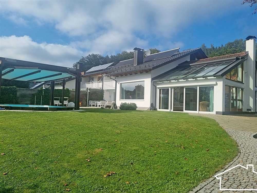 Die lichtdurchflutete Wohnhalle mit angrenzendem Wintergarten ist das Herzstück der Immobilie, der beheizbare Außenpool macht den Garten zum Freizeitpark.