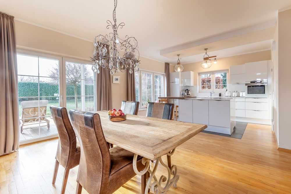 Im Erdgeschoss befinden sich ein Gäste-WC, ein Hauswirtschaftsraum mit Netzwerkverkabelung und ein Hobbyraum. Highlight ist der helle Wohn- und Essbereich mit Kamin und südlicher Ausrichtung, der durch die offene Küche mit Kochinsel ergänzt wird. Eine separate Speisekammer und der Zugang zur Sonnenterrasse oder zum überdachten Bereich bieten zusätzlichen Komfort.