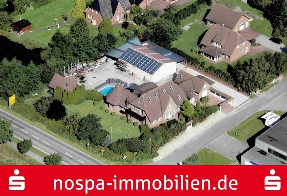 Individuelles, großzügiges Wohnhaus mit viel Wohn-/ Nutz- und Gewerbefläche. Auf dem ca. 2.500 m² großen Grundstück befinden sich ebenfalls eine Gewerbehalle mit Photovoltaikanlage, eine massive Garage, ein Carportanlage mit drei Stellplätzen und ein Außenpool.