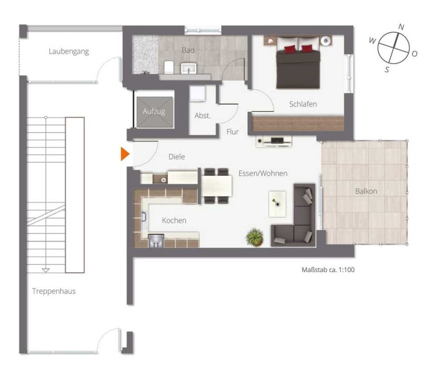 Der Zugang zu den Wohnungen erfolgt größtenteils über einen Laubengang mit geschützten, persönlichen Wohnungseingangsbereichen. Natürlich sind alle Etagen über den Personenaufzug erreichbar.