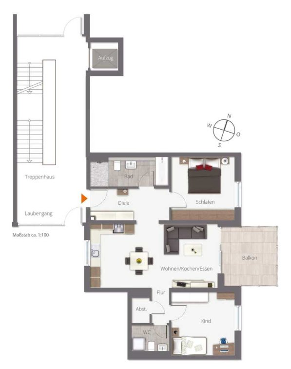Der Zugang zu den Wohnungen erfolgt größtenteils über einen Laubengang mit geschützten, persönlichen Wohnungseingangsbereichen. Natürlich sind alle Etagen über den Personenaufzug erreichbar.
