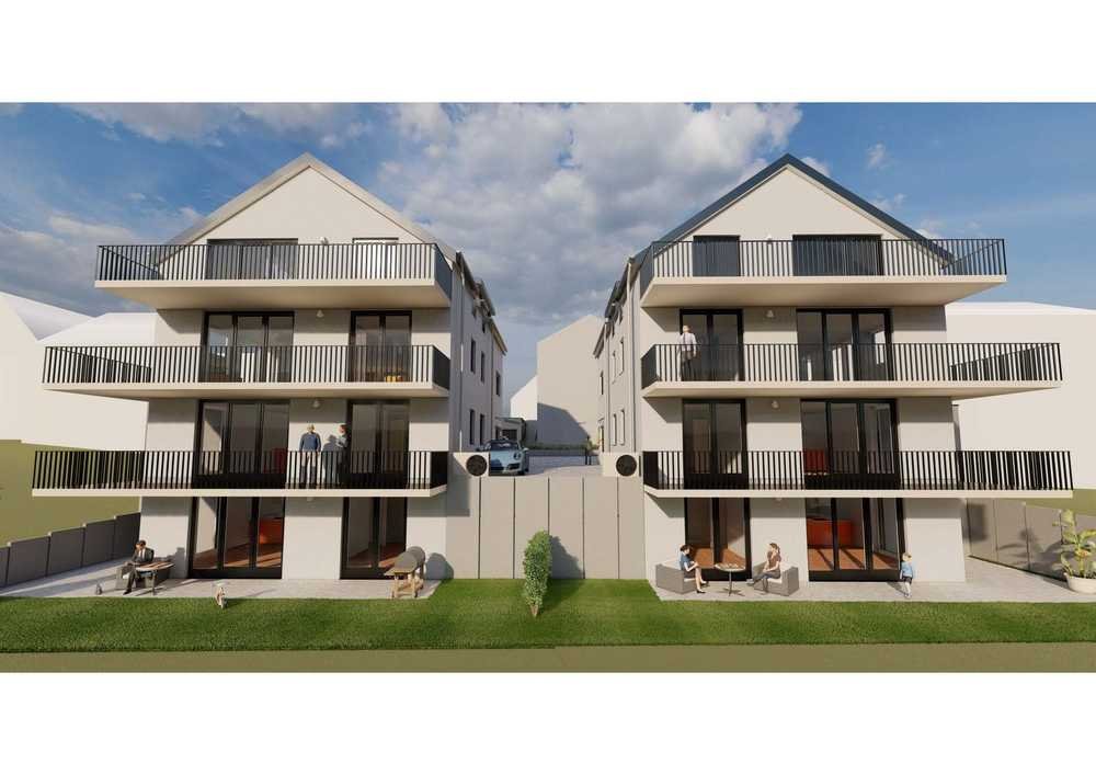 Hier entstehen in zweiter Reihe 2 innovative Mehrfamilienhäuser mit jeweils 4 exklusiv konzipierten, schlüsselfertigen Eigentumswohnungen nach KfW-Effizienzhaus 2023 EH55. Die Grundfläche der Wohnungen beträgt 90 bis 101 qm. Das hocheffiziente kostensparende Energiekonzept beinhaltet eine Luft-Wasser-Wärmepumpe mit Fußbodenheizung, dreifach verglaste bodentiefe Kunststofffenster mit hohem Dämmwert gegen Kälte, Hitze und Geräusche sowie eine Wohnraumbelüftung. Die ansprechende Architektur dieses Bauwerkes wird von modernen, nutzerfreundlichen Elementen geprägt. Beide Gebäude sind barrierefrei und verfügen jeweils über einen schallgedämpften Aufzug vom Keller bis zum Dach.