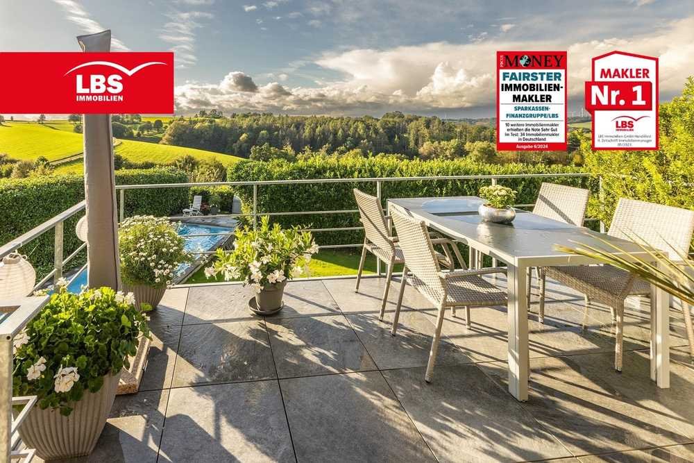 Den einmaligen Ausblick genießen Sie aus Ihrer Wohnetage heraus mit vorgelagerter Dachterrasse, und auch aus dem Gartengeschoß vom Bett Ihres Schlafzimmers aus schauen sie ins Grüne. Was will man mehr? Mehr Erholung finden Sie auf Ihrem über 1.000 qm großen Grundstück, auf dem ein aufwändiger Pool, beheizt mit einer modernen Wärmepumpe und Gegenstromanlage ausgestattet, bereit steht, und in dem Sie baden können ohne dass Ihre Nachbarn dabei zuschauen können. Aber auch mal eben auf den Golfplatz ist möglich und Pferdeliebhaber können ggf. ein Pferd auf dem eigenen Grundstück stellen - mit Blick auf eine nahe liegende Pferdekoppel.