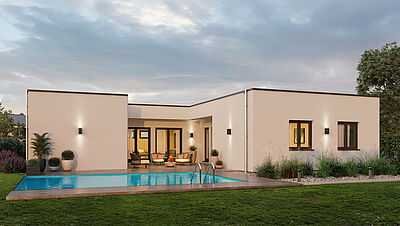 Hier trifft gehobener Komfort auf ein ebenerdiges Wohnkonzept, das auch im Alter noch in vollen Zügen genossen werden kann. Auf stolzen 160 m² Wohnfläche beweist unser Sunny 03, dass das Wohnen auf einer Ebene keinesfalls nur etwas für Senioren ist! So begeistert das Einfamilienhaus etwa durch sein modernes Flachdach und seine durchdachte Raumaufteilung, bei der jeder Quadratmeter sinnvoll genutzt werden kann und viel Platz für das gemeinsame Familienleben bietet. Neben zwei Kinderzimmern mit eigenem Dusch-WC und einem Eltern-Bereich mit modernem Badezimmer verfügt der Bungalow nämlich auch über ein eigenes Arbeitszimmer sowie ein Gäste-WC im Eingangsbereich des Hauses. Die Technik kommt im Hauswirtschaftsraum unter, während sowohl aus dem Ess- als auch aus dem Wohn-Bereich der direkte Zugang zur Terrasse möglich ist. Bodentiefe Fensterflächen erfüllen die Räume dabei mit hellem Tageslicht und steigern den Wohnkomfort zusätzlich.