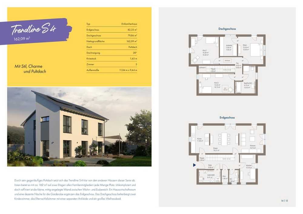 Das Einfamilienhaus Trendline S4 mit gegenläufiges Pultdach. Innen bietet es mit ca. 162 m² auf zwei Etagen allen Familienmitgliedern jede Menge Platz. Unkompliziert und doch raffiniert ist die kleine, mittig angelegte Wand zwischen Wohn- und Essbereich. Ein Hauswirtschaftsraum und eine dezente Nische für die Garderobe ergänzen das Erdgeschoss. Das Dachgeschoss beherbergt zwei Kinderzimmer, das Elternschlafzimmer mit einer separaten Ankleide und ein großes Wellnessbad.