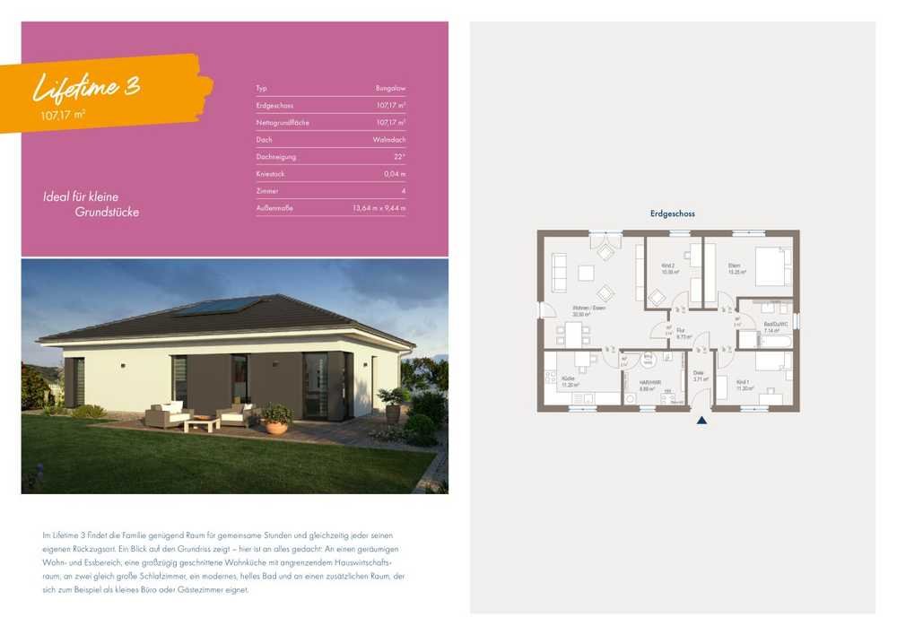 Im Lifetime 3 findet die Familie genügend Raum für gemeinsame Stunden und gleichzeitig jeder seinen eigenen Rückzugsort. Ein Blick auf den Grundriss zeigt - hier ist an alles gedacht: An einem geräumigen Wohn- und Essbereich, eine großzügig geschnittene Wohnküche mit angrenzendem Hauswirtschaftsraum, an zwei gleich große Schlafzimmer, ein modernes, helles Bad und an einen zusätzlichen Raum, der sich zum Beispiel als kleines Büro oder Gästezimmer eignet.