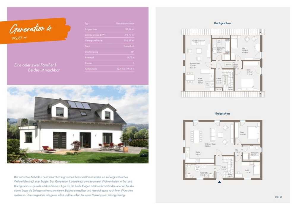 Erfreuen Sie sich an klaren Linien und zeitloser Wohnkultur. Genießen Sie eine perfekte und großzügige Raumeinteilung. Die innovative Architektur von Generation 4 garantiert modernen Baufamilien ein außergewöhnliches Wohnerlebnis. Mit durchdachten individuellen Lösungen bietet es absolute Behaglichkeit. Und das ganz nach Ihren Vorstellungen. Ob als Einfamilienhaus, oder als Haus mit Einliegerwohnung im Dachgeschoss - hier findet jeder den Freiraum, den er sich wünscht.