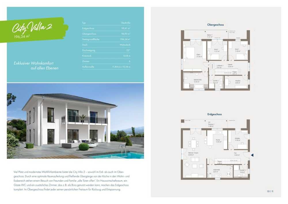 Viel Platz und modernstes Wohlfühlambiente bietet die City Villa 2- sowohl im Erd- als im Obergeschoss. Durch eine optimale Raumaufteilung und fließende Übergänge von der Küche und den Wohn- und Essbereich stehen einem Besuch von Freunden und Familie "alle Türen offen". Ein Hauswirtschaftsraum, ein Gäste-WC und ein zusätzliches Zimmer, das z. B. als Büro genutzt werden kann, machen das Erdgeschoss komplett. Im Obergeschoss findet jeder seinen persönlichen Freiraum für Rückzug und Entspannung.