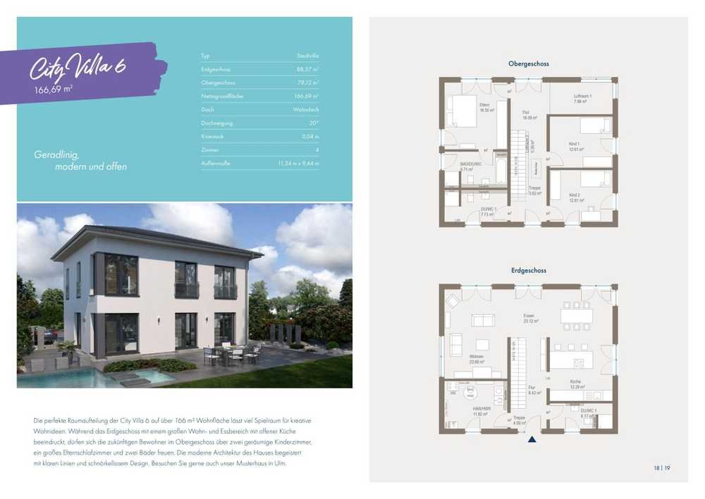 In modernem Stil präsentiert sich unsere City Villa 6. Perfekte Raumaufteilung auf über 166 m² ist viel Platz , da bleiben für kreative Köpfe keine Wünsche offen. Im Obergeschoss finden sich zwei Kinderzimmer mit einem tollen und großen Bad. Ein langer Flur, großer Wohn- und Essbereich, sowie eine offene Küche runden das Haus auf zwei Etagen ab.