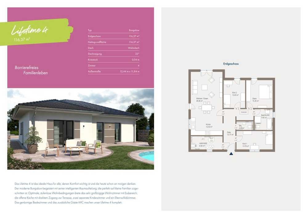 Lifetime 4 mit einer Grundfläche von über 110 Quadratmetern ist ein ideales Haus für die ganze Familie. Die intelligente Raumaufteilung mit einem sehr großzügigen Wohnzimmer mit Essbereich und direktem Zugang zur Terrasse, zwei separaten Kinderzimmern sowie einem Elternschlafzimmer, bietet traumhafte Wohnbedingungen. Diesen Bungalow könnt ihr - wie jedes unserer Häuser - zu mietähnlichen Konditionen verwirklichen und euch damit die Freiheit und Unabhängigkeit des Eigenheimbesitzers sichern.