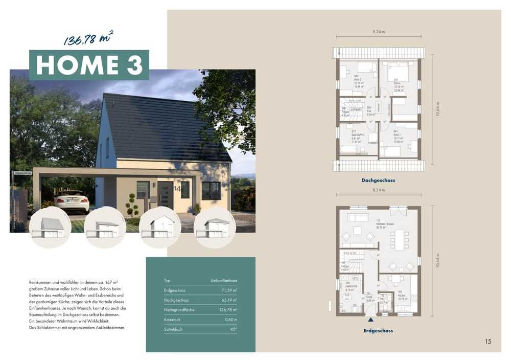 Reinkommen und wohlfühlen in deinem ca. 137 m² großem Zuhause voller Licht und Leben. Schon beim Betreten des weitläufigen Wohn- und Essbereichs und der geräumigen Küche, zeigen sich die Vorteile dieses Einfamilienhauses. Je nach Wunsch, kannst du auch die Raumaufteilung im Dachgeschoss selbst bestimmen.