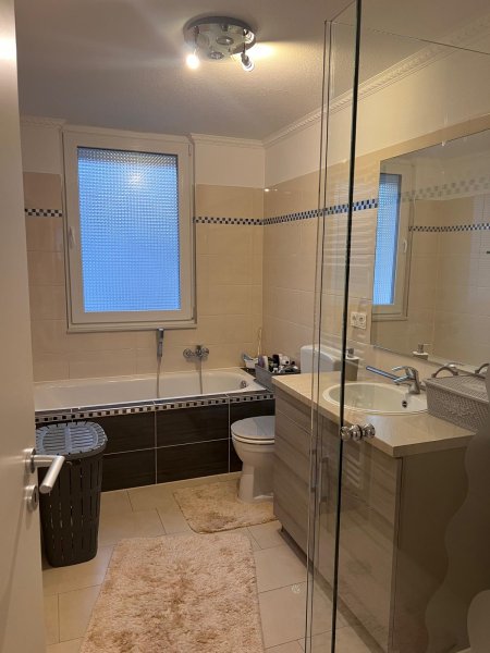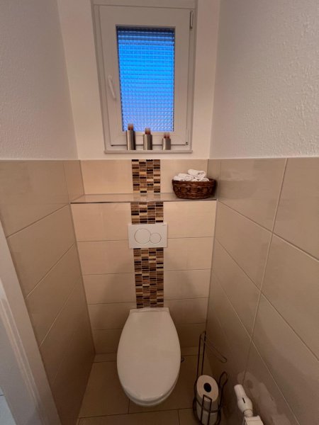 Das moderne Gäste-WC im EG ist lichtdurchflutet und ist recht überschaubar. Das recht moderne Badezimmer im OG ist ausgestattet mit einer Dusche und einer Badewanne, WC. Beide Räume sind gefliest.