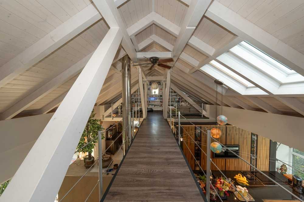 Dieses Anwesen vereint stilvolle Eleganz mit einer idyllischen Naturkulisse und bietet ein Wohnambiente der Extraklasse. Die umfassende Modernisierung im Jahr 2020 verlieh dem Objekt ein zeitloses, anspruchsvolles Design. Großzügige Raumhöhen, offene Grundrisse und bodentiefe Fenster schaffen eine lichtdurchflutete, weitläufige Atmosphäre. Ein besonderes architektonisches Highlight ist die elegante Brücke über dem Wohnbereich, die auf raffinierte Weise die Zimmer im Dachgeschoss miteinander verbindet. Die weitläufigen Fensterfronten eröffnen faszinierende Ausblicke auf den kunstvoll gestalteten Garten und unterstreichen die harmonische Verbindung von Innen- und Außenbereich.