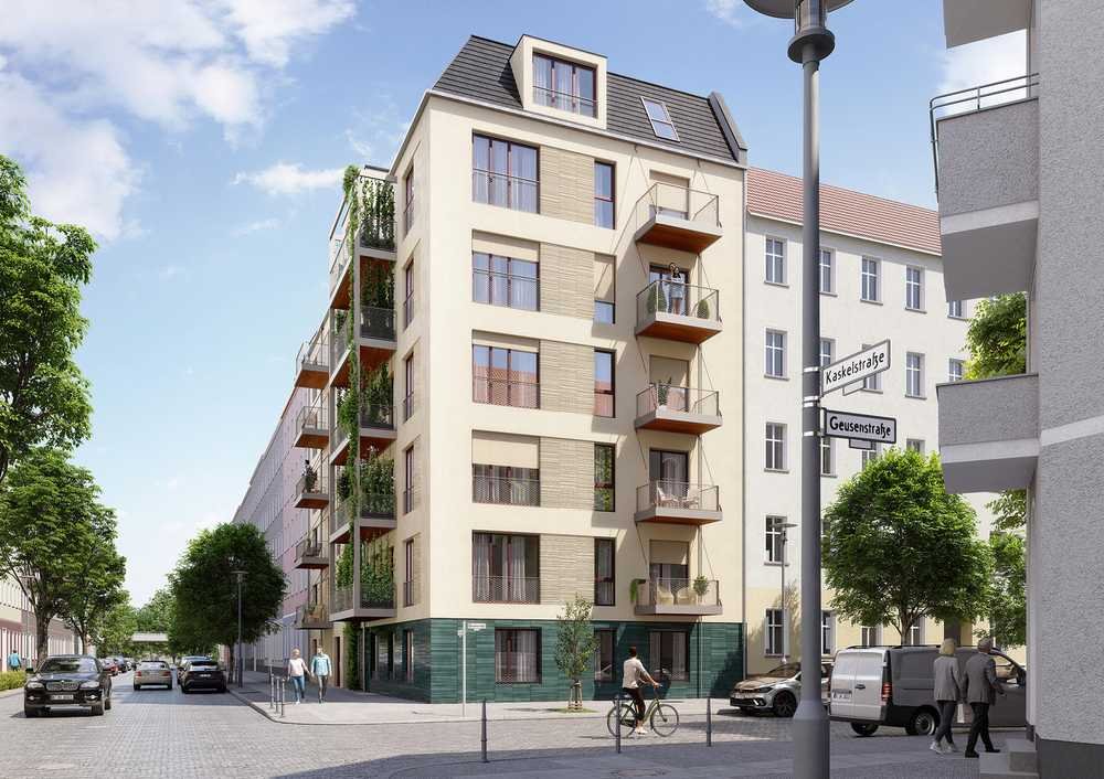 Der Holzhybridbau mit 21 Eigentumswohnungen spiegelt das Know-How prämierter Planungsbüros mit Klarheit in Funktionalität und Formgebung, Materialbewusstsein und -ehrlichkeit. Das QNG-Siegel für klimafreundliche Wohngebäude in der Effizienzhausklasse 40 und ein DGNB-Zertifikat in Gold für nachhaltige Bauweise werden seit Planungsbeginn vorausgesetzt und schlagen sich heute im etabliertesten Berliner Umweltpreis für dieses Projekt nieder. Die 2- bis 4-Zimmer-Wohnungen von ca. 50 bis 118 m² sind flexibel erweiterbar bis maximal 6 Zimmer mit ca. 176 m² und erlauben somit auch Konzepte für Mehrgenerationen-Wohnen. Das zukunftsfähige Energiekonzept des Gebäudes sorgt für einen konsequent CO2-optimierten Lebenszyklus mit langfristig niedrigen Nebenkosten. So erfolgt die Energieversorgung des Gebäudes u.a. über die Wärmerückgewinnung aus der Abluft sowie über Geothermie mittels Wärmepumpentechnik. Außerdem ergänzt eine Photovoltaikanlage auf dem Dach die Energiegewinnung und sichert unter anderem die Stromversorgung der Anlagentechnik.