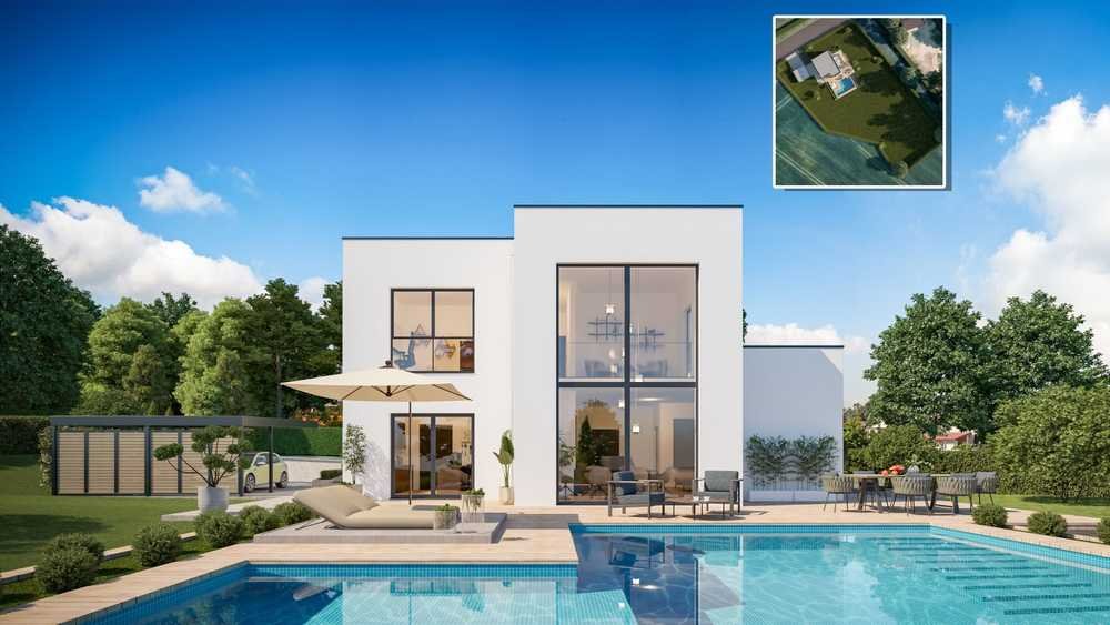 Diese zweigeschossige STREIF-Villa 1, besticht durch ihr modernes Flachdach und eine beeindruckende Glasfront, die den gesamten Gartenbereich aufwertet. Der Baukörper ist in einem kubistischen Stil gehalten und die Architektur clever gestaltet. Ein besonderes Highlight dieser Villa ist die weitläufige XXL-Glasfront, die sich über beide Etagen erstreckt und für ein außergewöhnliches Wohngefühl sorgt.
