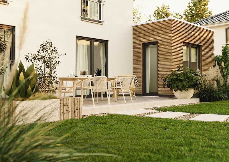 Die kubische Form ist der Klassiker im Stadthausdesign und prägt auch das Aussehen unseres Stadthaus Flair 124. Im Inneren setzt sich der urbane Stil fort: der großzügige Wohn- und Essbereich erstreckt sich über die gesamte Hausbreite und ist das Herzstück des Hauses. Große Fenster lassen viel Tageslicht hinein und führen gleich hinaus zu Ihrem Wohnzimmer im Grünen – der Terrasse.