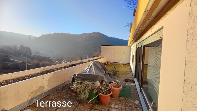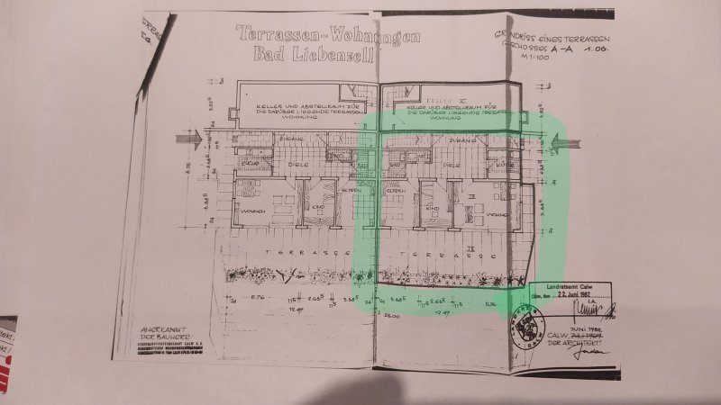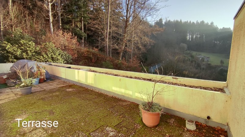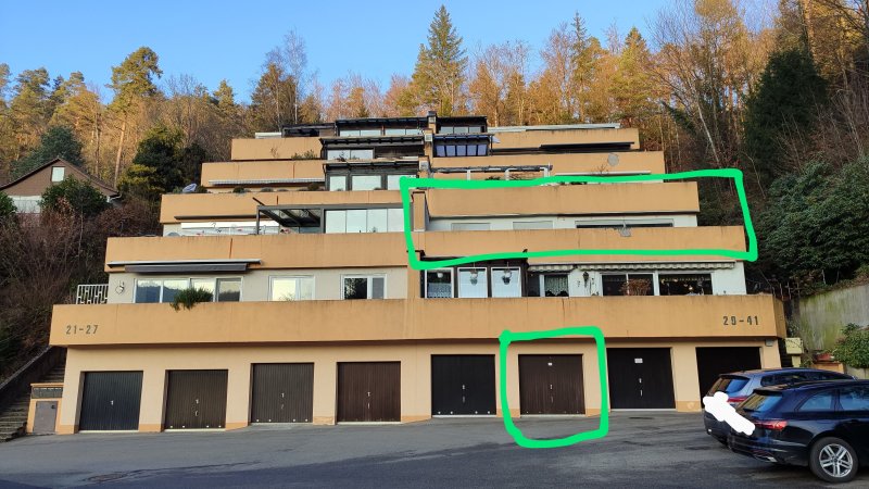 Auf der Eingangsebene ist die 94 m² große Wohnung und die rund 50 m² große Terrasse, darunter befindet sich der rund 50 m² große zum Teil ausgebaut Keller. Die große Terrasse hat einen unverbaubaren Blick auf die Burg in Bad Liebenzell und lädt zum Entspannen oder zur kreativen Gestaltung ein.