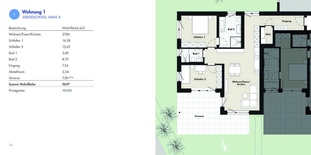 Zur attraktiven Erdgeschoßwohnung gehören 2 Schlafzimmer. Eines davon mit Ausgang auf die sehr großzügige Süd-/West-Terrasse. Den Bewohnern stehen 2 Tageslichtbäder mit exklusiver Ausstattung zur Verfügung. Der offen gestaltete Wohn- Essbereich mit Küche erstreckt sich über 38 m² und lässt keine Wünsche offen. Ein geräumiger Eingangsbereich mit Platz für einen Einbauschrank und der Abstellraum runden das Angebot ab. Den Bewohnern ein 100 m² großer Privatgarten zur Verfügung. Geparkt wird in der Tiefgarage. Angrenzend befindet sich der Kellerraum und ein gemeinschaftlich genutzter Fahrradraum.