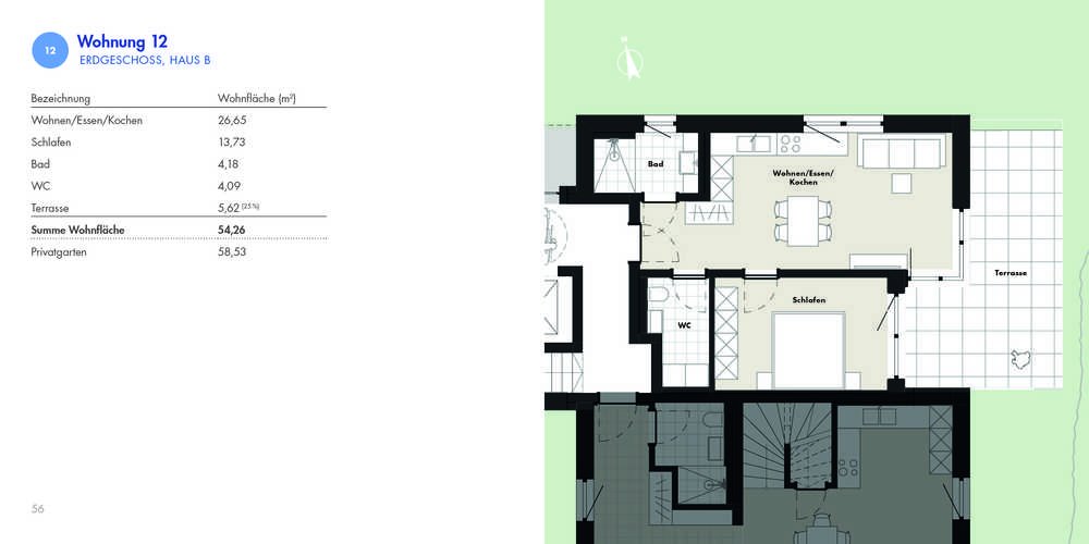 Wie alle Wohnungen ist auch diese mit dem Aufzug direkt aus der Tiefgarage erreichbar. Der Zugang ohne Treppen ist möglich. Die Ausführungen in der schwellenfrei. Über eine große Fensterfront erreicht man die Terrasse mit Ost-Süd-Ausrichtung. Dem Bewohner steht ein offen gestalteter Wohn-Essbereich, ein Schlafzimmer, ein Badezimmer und ein Gäste-WC zur Verfügung. Komplettiert wird das Angebot mit einem Kellerraum und einem gemeinschaftlichen Fahrradraum.