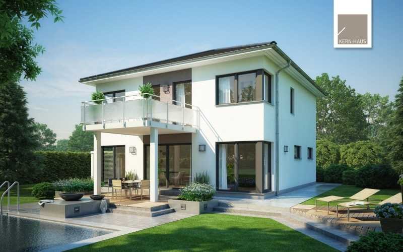 Die Außenansicht der Stadtvilla wird von symmetrischen, großen Fensterflächen und einer markanten Eckverglasung bestimmt. Ein Haus zum Wohlfühlen!