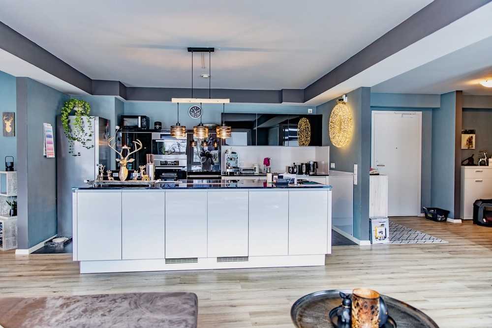 Der offene Wohn-Essbereich ist ein weiterer Höhepunkt der Wohnung. Er bietet viel Licht durch die bodenebene Fensterfront und schafft eine einladende, freundliche Atmosphäre. Darüber hinaus sorgt die Fußbodenheizung für ein angenehmes Raumklima während der kälteren Monate. Die integrierte Designerküche mit einer Kücheninsel ist nicht nur optisch ansprechend, sondern auch praktisch für das Zubereiten von Mahlzeiten und gesellige Zusammenkünfte.