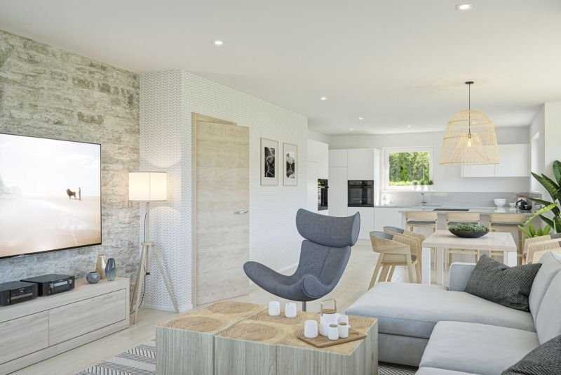 Außergewöhnlich ist die zentrale Lage der Treppe, unter der sich, wie hier dargestellt, ein Abstellraum befindet. Durch die Lage der Treppe, entsteht im oberen Geschoss eine schöne Galerie, von der aus alle Schlafräume und das Bad erreichbar sind. Im Erdgeschoss kommen Liebhaber großer und offener Wohnräume auf ihre Kosten, denn Kochen, Essen und Wohnen bilden hier eine großzügige Einheit. Verschiedene Bauteile können diesen Bereich zusätzlich zum Garten hin erweitern. Außerdem befindet sich im Erdgeschoss noch ein zusätzliches Zimmer, das ganz individuell als Homeoffice, Gäste- oder Spielzimmer genutzt werden kann.