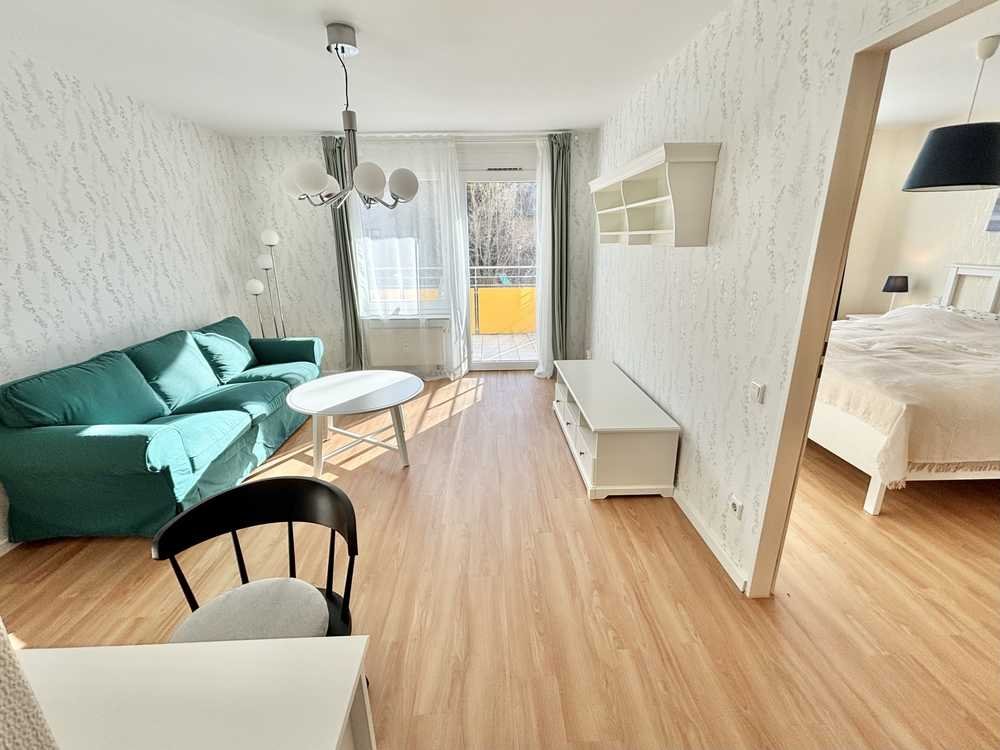 Verkauft wird eine renovierte Zweizimmerwohnung im Erdgeschoss. Zur Wohnung gehören ein Wohnzimmer mit Zugang zum Balkon, ein geräumiges Schlafzimmer, ein Flur, ein Bad mit ebenerdiger Dusche und Waschmaschine und Trockner und eine Küche mit Einbauküche.
