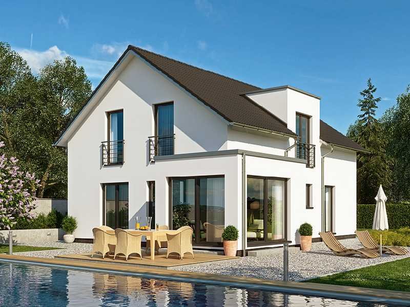 Die Anbauteilvariante Panorama-Cube vergrößert den Wohnraum unseres CLOU 156. Davon profitiert der großzügige Wohn-Essbereich, an den die Küche offen angeschlossen ist. Während im Erdgeschoss ein Gästezimmer geplant ist, bietet das Dachgeschoss Platz für zwei Kinderzimmer und das Elternschlafzimmer mit Ankleidebereich sowie das Bad.