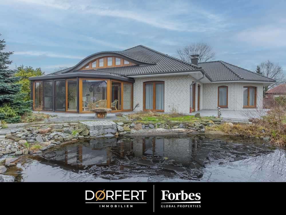 Das weitläufige Grundstück ist eine Oase der Ruhe. Die großzügige Terrasse lädt zu entspannten Stunden im Freien ein, während der idyllische Teich eine besondere Atmosphäre schafft. Der gepflegte Garten bietet viel Platz für Freizeitaktivitäten, gesellige Abende oder einfach zum Entspannen inmitten der Natur.