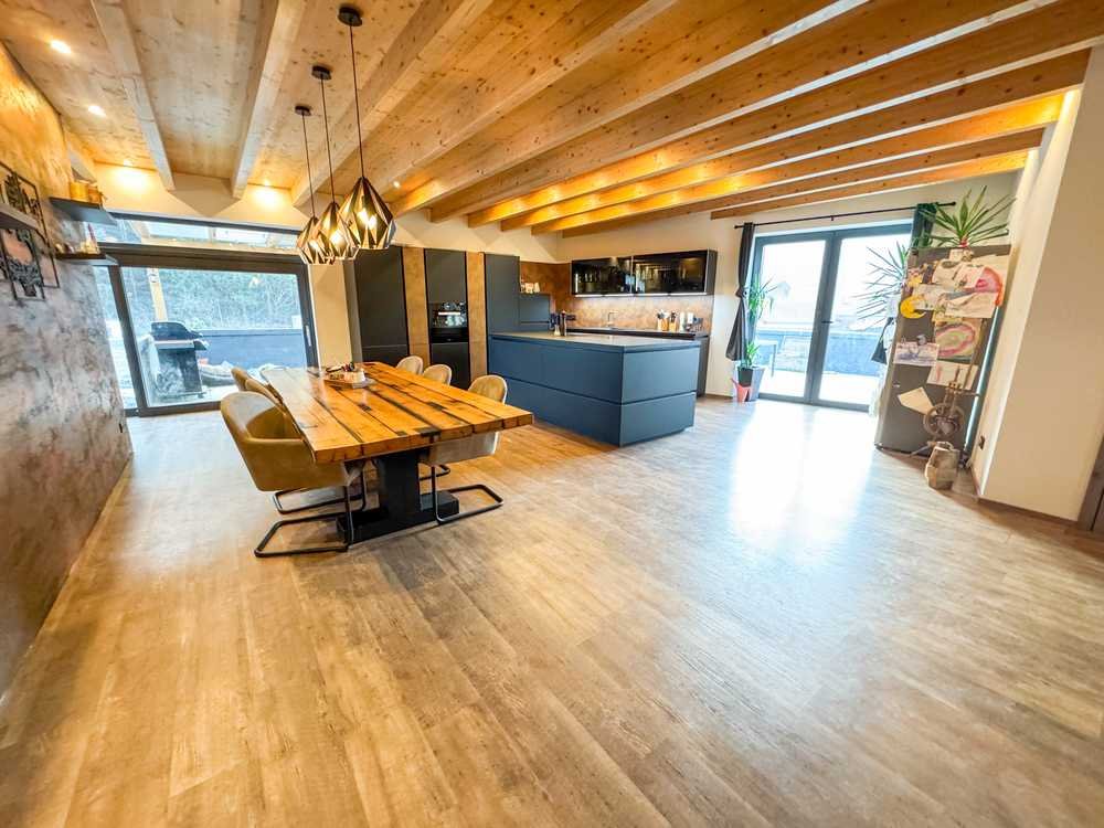 Edle Böden, die zum Barfußlaufen einladen, das großzügig geschnittene, lichtdurchflutete Wohn-/Esszimmer mit integrierter Küche lassen keine Wünsche offen.