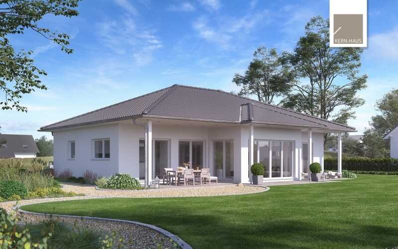 Der offen gestaltete Walmdach-Bungalow Kalea unterteilt sich geschickt auf knapp 130 Quadratmetern Wohnfläche. Schlafzimmer, Gäste- oder Arbeitszimmer, Wohn-/Essbereich, der Hauswirtschaftsraum und die Küche werden durch die Diele verbunden. Entlang der Mittelachse des Bungalows führt der freie Blick on der Haustür direkt in den Garten.