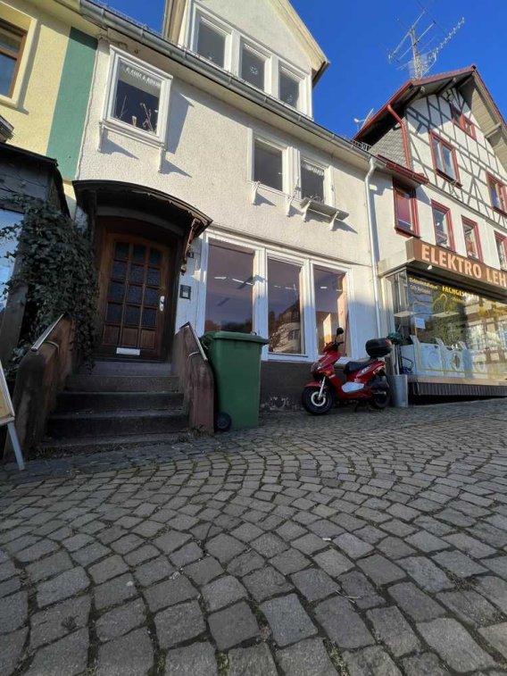 Fachwerkhaus am Marktplatz, Fachwerk noch nicht freigelegt, 40 m zum Schloß. Fußläufig entfernter (400m) großer Garten zum Haus gehörend direkt an Bachlauf und Schlossgarten mit historischem Wasserfall und Wasserrutsche. Garten ist nicht Teil des Verkaufes, kann aber zum Teil genutzt werden. Ein halber Hektar Nutzwald im Aufwuchs, 400m vom Garten, kann ebenfalls genutzt werden.